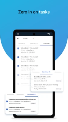 ابقَ متقدماً بخطوة من خلال جدولة الأنشطة المستقبلية وتحديث التفاصيل أولاً بأول، حتى أثناء توجهك إلى اجتماعك التالي. يمكّنك الوضع الفريد للوصول دون اتصال بالإنترنت من البقاء على اطلاع دائم ببيانات عملائك، ضامناً استمرارية عملك وتواصلك الفعال بغض النظر عن جودة الاتصال. تتبع المقاييس الرئيسية المتاحة مباشرةً على هاتفك، استخدم الفلاتر لتحديد جهات الاتصال الأكثر أهمية، وركز على الصفقات الواعدة لتغيير مراحلها فور تقدمها، مما يختصر دورة مبيعاتك بفعالية.