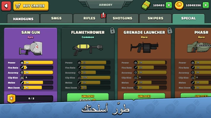 جهز ترسانة أسلحتك من بين مجموعة واسعة تضم أحدث البنادق وأكثر الأسلحة ابتكاراً للمستقبل. سواء كنت تفضل الأسلحة الآلية سريعة الإطلاق أو قاذفات الصواريخ المدمرة أو أسلحة الطاقة المتطورة، ستجد ما يناسب أسلوب لعبك القتالي تماماً. وعندما ترغب في تحدٍ منفرد، انغمس في وضع البقاء على قيد الحياة المثير دون اتصال بالإنترنت، حيث تختبر قدرتك على الصمود ضد موجات لا نهاية لها من التهديدات. لتعزيز تجربتك، تتضمن اللعبة خيارات شراء اختيارية تتيح لك تخصيص مقاتلك أو الحصول على عناصر إضافية، بما في ذلك بعض المفاجآت المثيرة التي تضفي المزيد من الحماس على رحلتك القتالية.