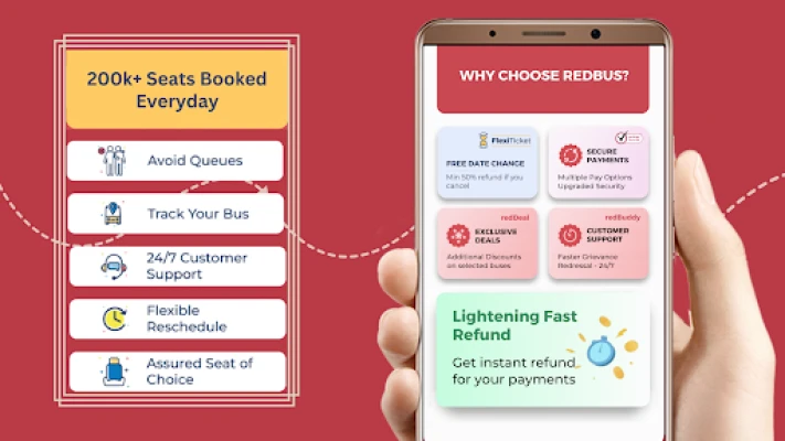 لا تقتصر خدمات redBus على الحافلات والقطارات فحسب؛ بل يمتد ليشمل حجوزات الفنادق والمترو. اكتشف شبكة ضخمة من الفنادق الاقتصادية والمنتجعات في أكثر من 2000 مدينة هندية، واستفد من عروض حصرية على أكثر من 30 ألف مكان إقامة، مدعومة بتقييمات حقيقية من العملاء. بالإضافة إلى ذلك، يمكنك الاستفادة من ميزة FlexiTicket لتغيير موعد رحلة الحافلة مجانًا حتى 8 ساعات قبل المغادرة، والحصول على استرداد فوري للأموال، والدعم الفني على مدار الساعة طوال أيام الأسبوع. ولتتبع رحلاتك بكل سهولة، يتيح لك redBus البقاء على اتصال عبر ساعتك الذكية بنظام Wear OS، مع تحديثات فورية وتنبيهات لمسية. استفد دائمًا من فرص التوفير المتجددة عبر خيارات دفع متعددة، لتجربة سفر لا مثيل لها.